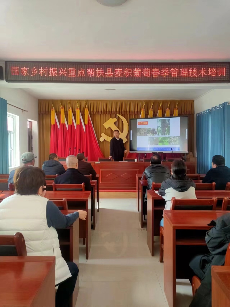 3月20日至22日,国家乡村振兴重点帮扶县麦积科技特派团葡萄产业组王玉安研究员在麦积葡萄主产乡镇新阳、社棠以及新植葡萄乡镇琥珀开展培训。培训中针对天水佳果源农业科技有限公司、麦积区丰农园种植农民专业合作社等5家新型经营主体生产中存在的主要问题,以《葡萄建园、春季管理及绿色优质高效栽培》为题开展了实用技术培训,培训采用室内集中和田间指导的方式,从葡萄科学建园,水肥管理,主要病虫早期预防,花果科学管理等方面进行讲解,共培训新型经营主体技术负责人及当地技术带头人50余人。