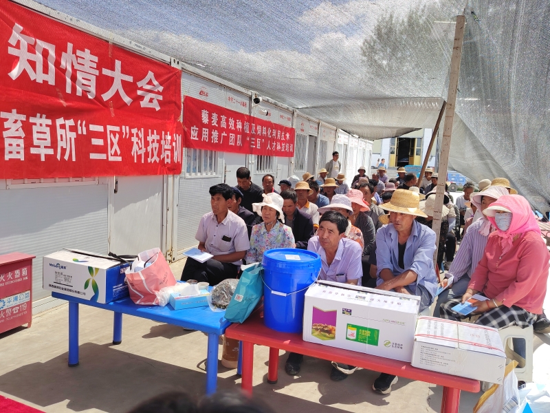 为进一步助力积石山灾后产业重构与产业升级,7月3日,畜草所藜麦高效种植及饲料化利用技术应用推广“三区”服务团队依托我院积石山现代农业产业研究院-畜牧业农科小院平台,团队成员黄杰、魏玉明等一行5人赴积石山县甘藏村和石塬村开展藜麦绿色高效生产技术、饲草作物新品种引进及提质增效配套技术等5个方面的技术培训。随后,科技服务团队赴甘肃宇鹏农业发展有限公司、积石山县禾森农业科技农民专业合作社和万珠种养农民专业合作社等地,就优质饲草种植、藜麦栽培和肉羊养殖中存在的问题进行现场指导和解答。培训得到了县农业技术推广中心和石塬村委会的充分肯定,并获得合作社、种养殖户的一致好评。培训现场发放科技培训资料300余册,藜麦种子60袋、肥料30袋、农药8箱、益生菌60公斤、舔砖100公斤,培训当地种植与养殖人员120余人。