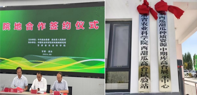 8月9日,甘肃省农业科学院西甜瓜高台试验站及国家西瓜甜瓜种质资源中期库高台展示中心揭牌仪式在高台县巷道镇殷家桥村举行。甘肃省农业科学院蔬菜研究所、中国农业科学院郑州果树研究所与高台县签订三方合作框架协议,三方将联合共建国家西瓜甜瓜种质资源中期库高台展示中心。甘肃省农业科学蔬菜研究所与高台县农业农村局签订技术服务合作协议,在高台县开展西瓜甜瓜种质资源展示及科研服务。