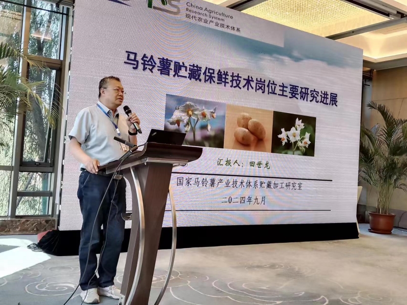 会上,10位岗位科学家和企业代表分别围绕各自产业“采后保鲜和贮藏运输中存在的问题、园艺产品的采收、保鲜、病害、贮藏、运输”等突出共性问题进行汇报交流。田世龙研究员作了题为“马铃薯贮藏保鲜技术岗位主要研究进展”的报告,介绍了马铃薯产业近年的产业发展情况及十四五期间马铃薯岗位的研究进展;并对由程运江教授牵头主编教材《园艺产品采后生产理论与实践》编写内容进行了讨论。