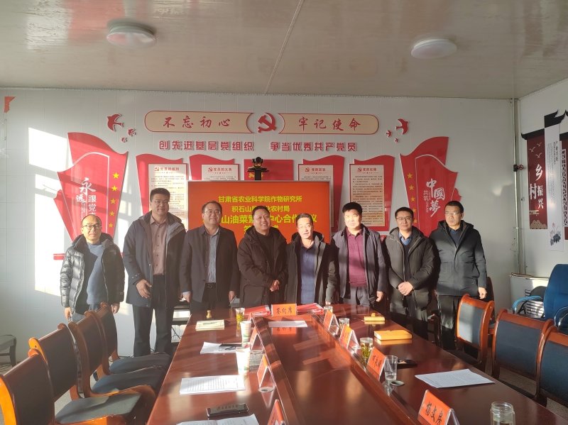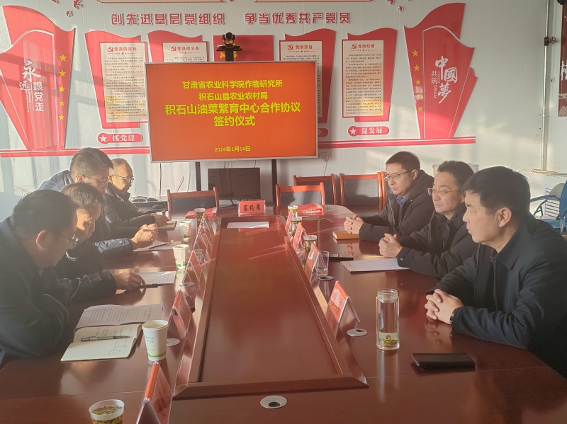 2025年1月14日,作物研究所与积石山县农业农村局签订“甘肃省农业科学院积石山油菜繁育中心”建设合作协议。作物所党总书记、所长张建平,副所长王兴荣,积石山现代农业产业研究院常务副院长张朝巍,积石山县农业农村局局长何永明,副局长杨文房、王建军,县农技中心副主任马礼真及作物所相关科技人员参加会议。