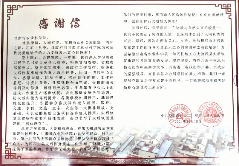 郭永督讲到,在积石山县发生地震灾害后,你们第一时间伸出援手,主动参与我县灾后农业产业重建工作,成立临时党支部,建立甘肃省农业科学院积石山现代农业产业研究院,设立蔬菜、畜牧、中药材、粮油和林果5个“农科小院”,选派58名高级专家,驻“院”开展党组织共建、科技创新、技术指导等工作,试验示范农作物新品种40余项、新技术30余项,示范面积1600余亩,编制《积石山县地震灾后恢复重建农业产业重构发展建议》,为我县提供强有力的精神鼓励和科技支撑,推动我县农业产业升级发展迈出坚实步伐。天灾无情、人间有爱,积力之所举,则无不胜;众智之所为,则无不成。在贵单位大力帮助下,积石山县灾后重建工作取得了阶段性成效,农业产业得到了显著发展。在这岁暮冬月,积石山县委、县政府向贵单位致以衷心的感谢和崇高的敬意。诚祝贵单位在新的一年里中流奋楫、再创佳绩。