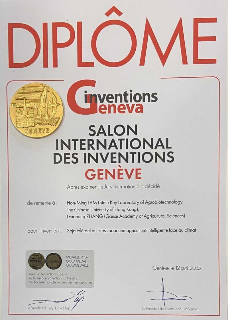 2025年在瑞士举行的第50届日内瓦国际发明展(International Exhibition of Inventions Geneva)上,由我院旱农所张国宏研究员大豆研究室团队与农业生物技术全国重点实验室主任、香港中文大学林汉明教授团队联合培育的陇黃1号、陇黄2号、陇黄3号大豆新品种荣获评审团特別嘉许金奖。评审团特别嘉许金奖是从金奖中选拔产生的,需要评审团全票通过,是发明展的最高级别奖项。