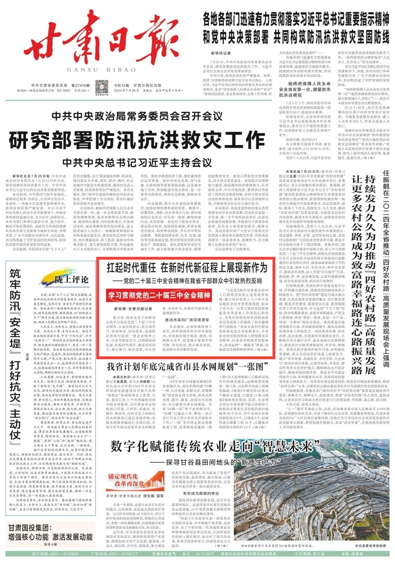 7月26日,甘肃日报头版以《扛起时代重任 在新时代新征程上展现新作为》为题报道我省干部群众热议党的二十届三中全会精神。院党委书记刘国汉代表我院就认真学习贯彻党的二十届三中全会精神作表态。他表示:省农科院将对标对表党中央作出的进一步深化改革的战略举措,锚定深化科技体制改革、深化人才发展体制机制改革等重大改革任务,坚持“四个面向”,发挥“引领、支撑、服务”职能,聚力打造现代一流农业科研院所,大力推进有组织的农业科技创新,围绕农业优质种质资源收集与利用、生物育种、农机装备研发、农产品质量安全、智慧农业等领域开展核心技术攻关。深化科技评价体系改革和科技成果转化机制改革,加快构建全省农业科技创新体系,奋力谱写新时代“三农”工作新篇章。
