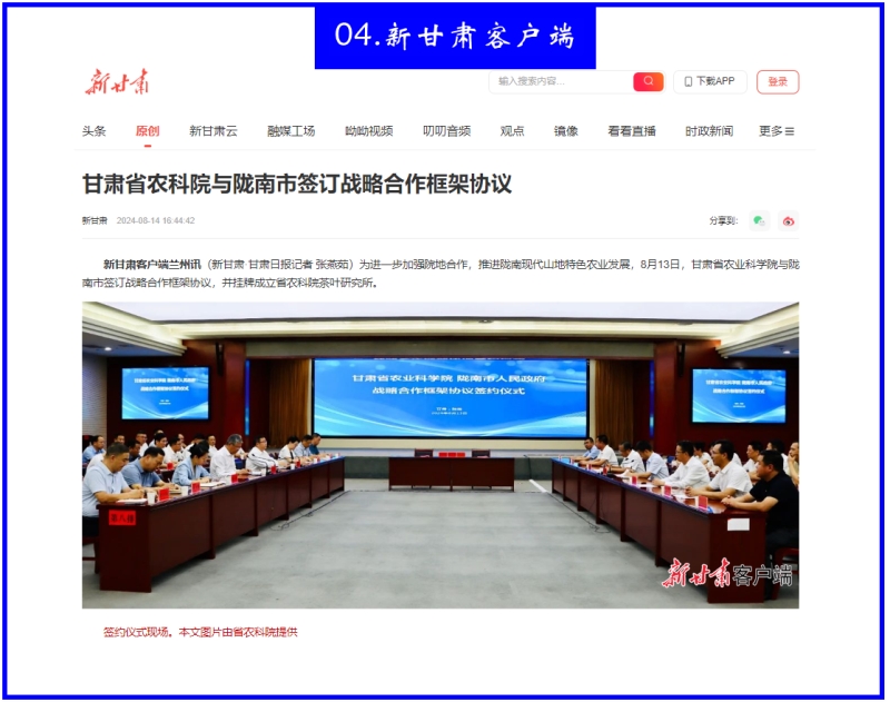 8月14日,新甘肃客户端以《甘肃省农科院与陇南市签订战略合作框架协议》为题报道我院合作交流成效。