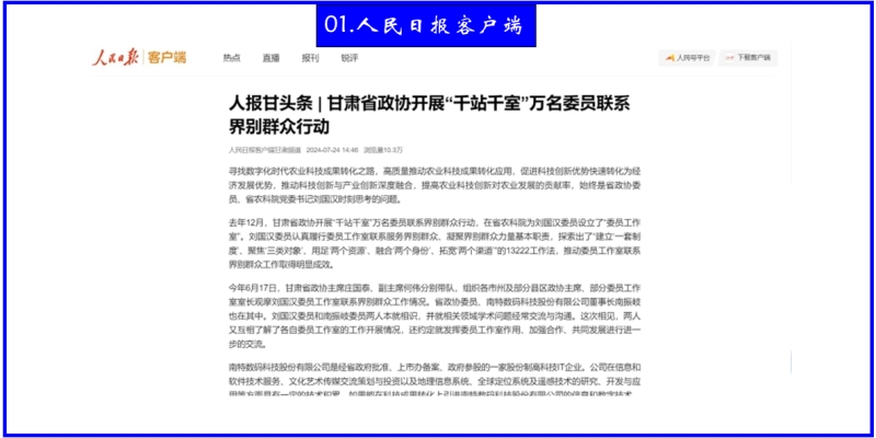 7月24日,人民日报以《甘肃省政协开展“千站万室”万名委员联系界别群众行动》为题报道省政协委员、我院党委书记刘国汉认真履行委员工作室联系服务界别群众、凝聚界别群众力量基本职责,探索出了“建立‘一套制度’、聚焦‘三类对象’、用足‘两个资源’、融合‘两个身份’、拓宽‘两个渠道’”的13222工作法,推动委员工作室联系界别群众工作取得明显成效。