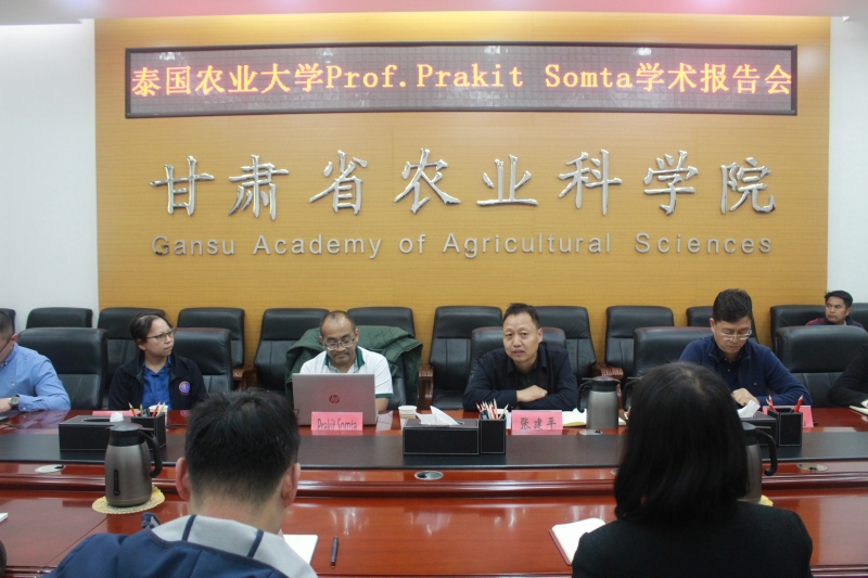 会后开展了学术交流活动,学术报告会由作物研究所党总支书记、所长张建平主持。Prakit Somta教授做了题为“Discovery of Genes for Bioticand Abiotic Stress Resistance in Mungbean (Vigna radiata)”的报告,详细介绍了泰国农业大学在绿豆抗白粉病、抗叶斑病、抗豆象和抗盐碱基因发掘、精细定位及表型鉴定方面取得的重要进展和经验,我院30多名科技人员聆听了报告,并与其进行了深入的讨论与交流。