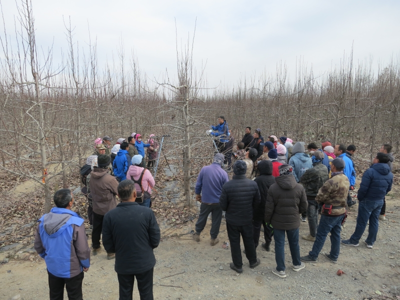 在甘肃条山集团梨示范园,李红旭研究员针对新建省力密植梨园与传统栽培模式梨园农户修剪中存在的问题,从两种栽培模式树体整形要点,今年冬季修剪重点要解决的树体上强、主枝过多、结果枝组偏大、树冠郁闭等问题,以及解决这些问题的整形修剪方法与思路,并在条山集团梨种植基地的山坡地、二斗、三队、六队、十三队等不同片区梨园开展修剪示范培训5场次,同时结合冬季修剪发放《梨宽行密植立架栽培技术规程》、《果树枝条堆肥还园技术规程》、《苹果营养诊断技术规程》等3项标准200份。本次累计培训条山集团技术人员、梨园管理职工及周边种植大户及果农240余人次,培训受到企业和果农的一致好评,取得了良好的效果。