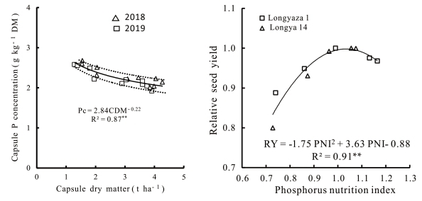 近期,我院作物所胡麻研究团队通过5个施磷水平的3年2点大田试验,研究了2个胡麻品种的蒴果干物质积累规律,建立了胡麻磷稀释曲线: Pc = 2.84×CDM-0.22(R2= 0.87, P < 0.01),并发现磷素营养指数(PNI)与磷素施用量呈显著正相关,且与胡麻相对籽粒产量密切相关。蒴果Pc稀释曲线可以作为一种简洁、快速的工具来诊断中国西北地区胡麻生殖生长阶段的磷状况,为胡麻生殖生长过程中磷肥的精准施用提供依据。相关研究论文《Determination of Critical Phosphorus Dilution Curve Based on Capsule Dry Matter for Flax in Northwest China》发表在《Agronomy》上。