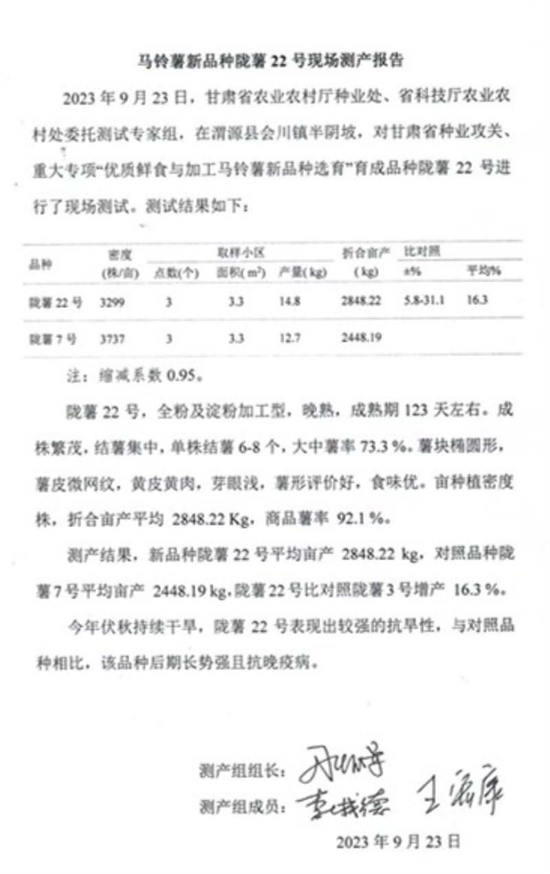 专家组通过对甘肃农业大学张掖高台新品种成果转化基地、山丹试验站;省农科院马铃薯研究所古浪新品种成果转化基地、会川试验站及省种子总站定西新品种筛选及示范基地现场观摩检查,并对项目育成的淀粉及全粉加工型马铃薯新品种陇薯22号等5个新品种实地测产,项目选育的专用马铃薯新品种在不同生态区表现优异,为马铃薯产业发展提供了品种支撑,建议加快与企业合作,尽快实现专用品种产业化,对项目专用品种加工中试、规模化示范、经费管理及2024年项目验收提出了指导性意见。