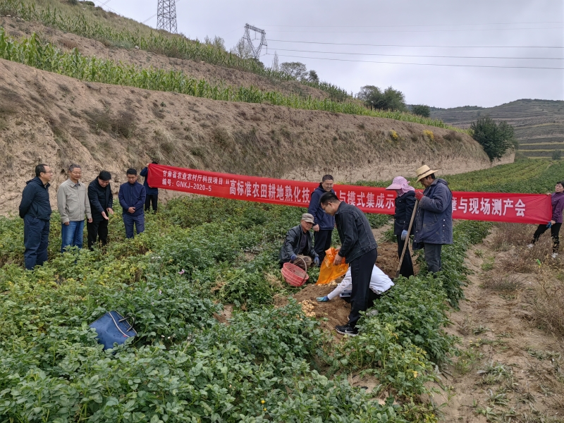 10月1日,我院旱地农业研究所与项目合作单位省农业技术推广总站邀请甘肃农业大学张峰教授、定西市农业科学研究院张明研究员和我院科研管理处张礼军研究员等专家组成测产小组,在定西市安定区对双方联合实施的“高标准农田耕地熟化技术研究与模式集成示范”项目进行了现场观摩和测产,会议由省农业技术推广总站李世成研究员主持。测产结果显示,在今年项目实施区域遭受严重干旱胁迫的情况下,项目组研发的综合培肥技术模式培肥增产效果显著,使新垦高标准农田挖方和填方马铃薯亩产分别达到1185.6kg和1503.4kg,较传统熟化培肥模式增产40%以上,大薯率提高了73%以上。