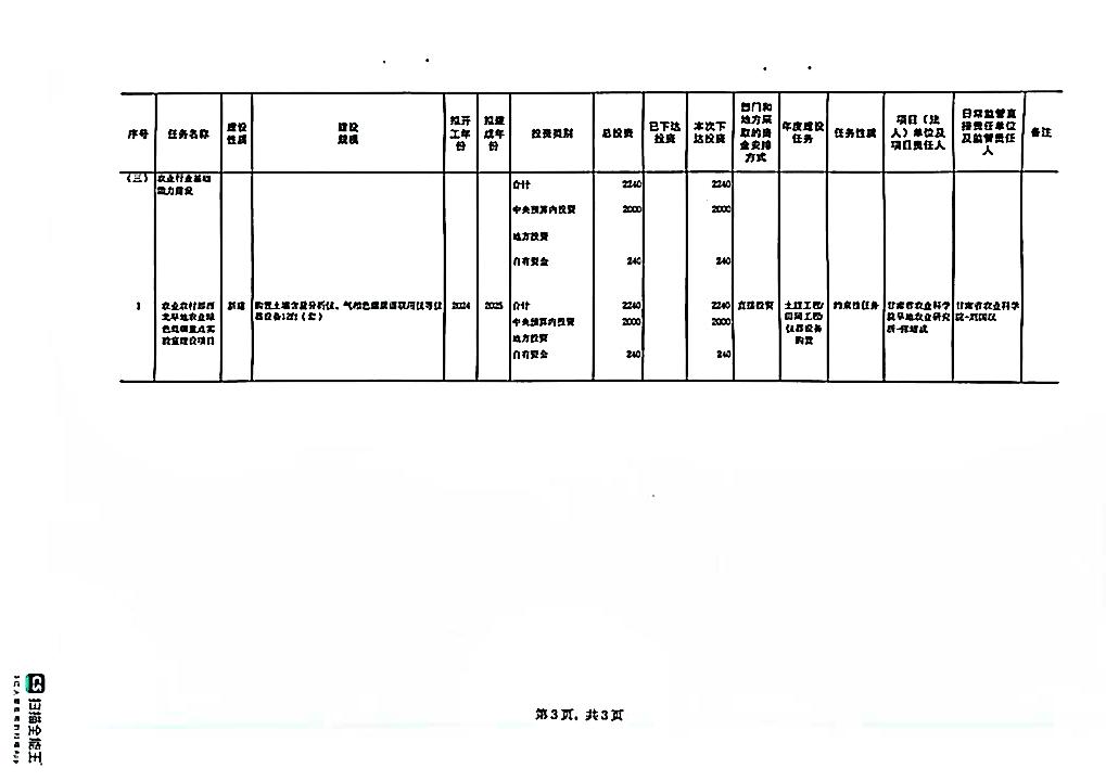 4、旱地农业研究所承担的农业行业基础能力建设项目:《农业农村部西北旱地农业绿色低碳重点实验室建设》获批总投资2240万元,其中,中央预算内投资2000万元。