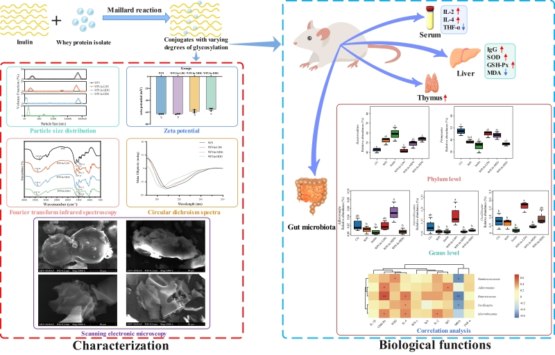 团队聚焦河西地区乳品企业生产废料乳清蛋白和寒旱特色作物菊芋,通过美拉德反应制备了不同糖基化程度(DG)的乳清蛋白-菊粉(WPI-In)复合物。表征分析表明,高糖基化乳清蛋白-菊粉复合物(WPI-In-HDG)粒径更小、分散稳定性更优,且表面形成多孔网络结构,抗氧化活性更高。通过动物实验发现WPI-In-HDG可显著增加小鼠肠道拟杆菌门(Bacteroidetes)丰度,降低厚壁菌门(Firmicutes)比例,并特异性富集具有抗炎功能的Adlercreutzia属和产短链脂肪酸的Marvinbryantia属。Spearman相关分析表明,肝脏抗氧化能力的增强和免疫相关指标的调节可能与WPI-In结合物改变的肠道微生物群有关。该研究证实了WPI-In-HDG具备免疫调节功能,为寒旱特色作物菊芋在生物医药方面的应用和开发提供了新的路径。