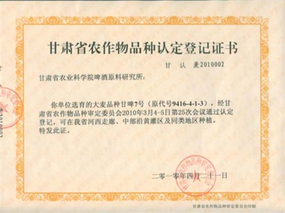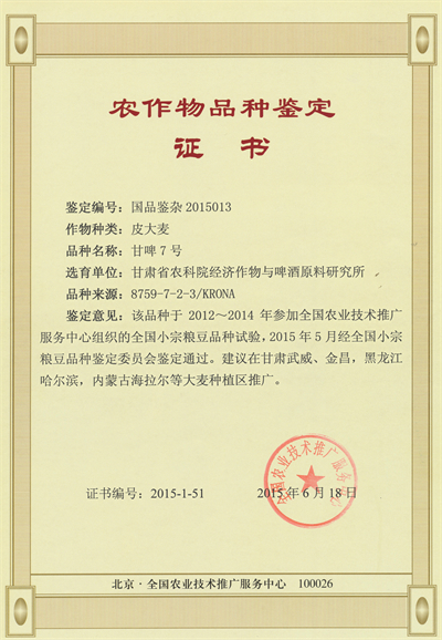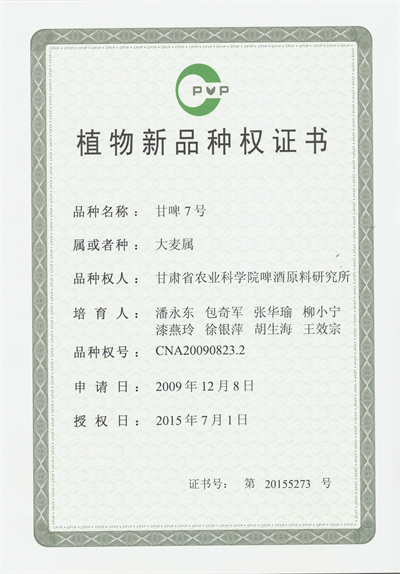 甘啤7号系甘肃省农业科学院经济作物与啤酒原料研究所杂交选育而成的啤酒大麦品种。2010年通过甘肃省品种审定委员会认定定名甘啤7号;2015年通过全国小宗粮豆品种鉴定委员会鉴定(国品鉴杂2015013)。为二棱皮大麦。2015获得国家植物新品种权,品种权号:CNA005112E,品种权证书号:第20155273号。