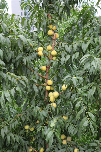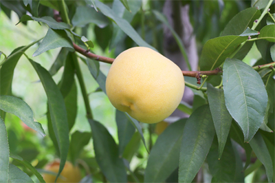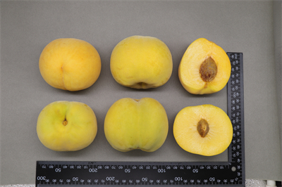 果实发育期120天,晚熟品种。平均单果重180克,最大单果重246克;可溶性固形物含量14.4%,果肉黄色,硬溶质,粘核,风味甜;果实近圆形,果顶微凸,果形端正,果实底色黄,果面不着色。该品种在兰州安宁区8月中旬成熟。适宜在甘肃省兰州市、天水市、陇南市等桃产区种植。