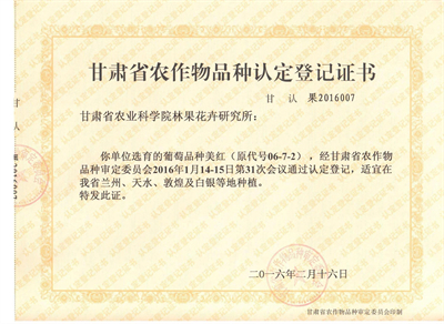 ‘美红’是以‘红地球’为母本,‘6-12’为父本,通过杂交选育出的中熟葡萄新品种。2016年通过甘肃省农作物品种审定委员会认定。该品种平均单穗质量716g,平均单粒质量9.1g,果粒长圆形,果皮紫红色,可溶性固形物含量17.9%,总酸含量0.30%,果肉硬脆,品质上等。每果粒含种子2~3粒。在甘肃兰州安宁露地8月下旬成熟,植株生长势较强,成花容易,具有较强的抗性和适宜性,易于管理。‘美红’具有果粒大,穗形外观漂亮,肉质硬、脆,汁液多,酸甜适口,耐贮运等优点,在同期成熟品种中占有显著优势。该品种结果稳定,挂果时间长。‘美红’在甘肃省河西走廊的敦煌、民勤,中部沿黄灌区的兰州、白银以及天水等大部分地区可以引种栽培。建议葡萄种植公司、种植大户、家庭农场等新型经营主体规模化种植。
