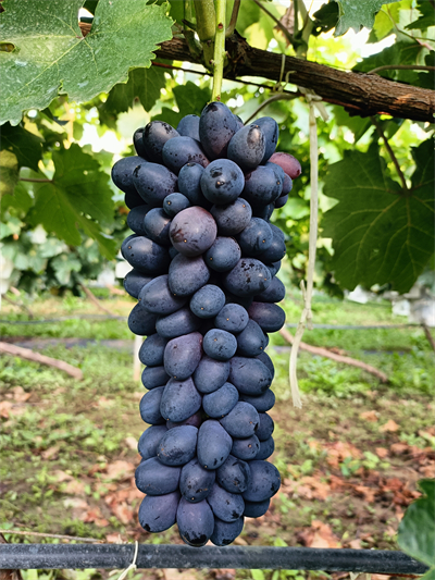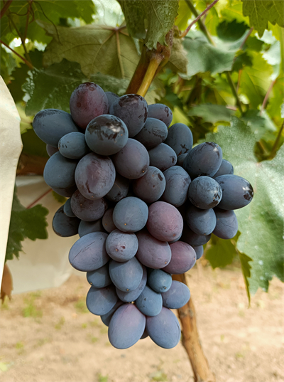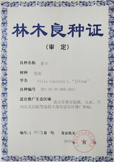 ‘紫丰’是以‘红宝石无核’为母本,‘黑爱莫’为父本,通过田间杂交、利用胚挽救技术选育出的无核葡萄新品种。该品种早果,丰产性好,平均单穗质量435g,平均单粒质量4.4g,果粒为鸡心形,果皮紫黑色,易着色,皮薄,可溶性固形物含量18.50%,可溶性糖含量13.60%,可滴定酸含量0.32%,维生素C含量0.0038%。果肉细脆,品质上等。在甘肃兰州安宁8月下旬至9月上旬成熟,植株生长势较强,成花容易,具有较强的抗性和适应性,易于管理。该品种为优质中熟无核葡萄新品种,具有穗形外观漂亮,肉质细、脆,酸甜适口,耐贮运等优点,在同期成熟品种中占有显著优势。植株生长势强,结果稳定,挂果时间长。‘紫丰’在甘肃河西走廊的敦煌、民勤,中部沿黄灌区的兰州、白银以及天水等大部分地区均适宜引种推广,省外同类地区可参照引种示范。建议葡萄种植公司、种植大户、家庭农场等新型经营主体规模化种植。