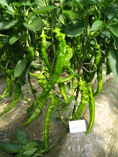 特征特性:辣椒杂交一代品种。2018年通过国家品种登记。长势强,中-晚熟,产量高。果实粗长羊角形,果面皱褶较少。商品果深绿色,果长30 cm,果肩宽3.5~4.0 cm,果肉厚3.5mm,单果重105g。辣味中等。纤维细,风味好,品质优良。中抗辣椒病毒病和疫病。比陇椒2号增产25.8%。