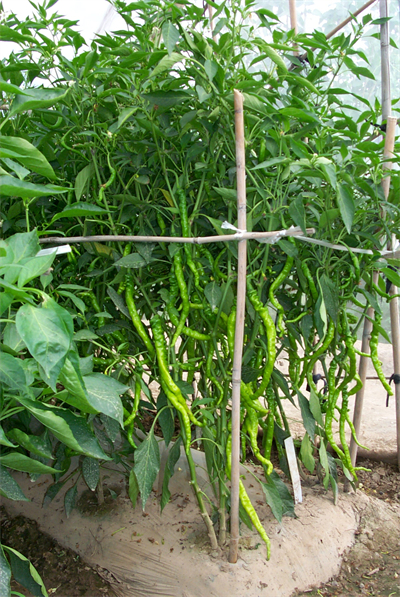 特征特性:制干加工专用品种。中早熟,植株长势较强,果实细长羊角形,果面轻微皱褶,果长28-30cm,果肩宽1.8-2.2cm,果肉厚2.2mm,单果重28-35g。光泽度中,耐运输。丰产性较好,制干率高。香辣。中抗病毒病,中抗炭疽病,中抗辣椒疫病。一般亩产鲜椒3200kg,干椒330kg左右。适宜甘肃、陕西省露地种植。