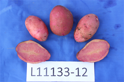 陇薯26号,原代号L11133-12,鲜食及彩色薯片加工型。生育期100d左右,中晚熟。植株直立,株高约70cm,茎绿带紫红色,叶片绿色,小叶稀疏,叶面微皱,叶缘波状,花冠白色,星形,萼片绿色。薯块长椭圆形,薯皮红色光滑,芽眼浅,薯肉红色近皮层黄色,薯块含干物质19.47%,粗淀粉13.50%,还原糖0.16%,粗蛋白2.77 g/100g,维生素C 17.65 mg/100g,铁15.4mg/kg,锌3.13 mg/ kg,硒10.62ug/kg(干基)。油炸薯片色泽鲜艳美观,口感酥脆,薯香味浓。平均亩产2432.70kg。适宜在甘肃省高寒阴湿区、二阴地区及半干旱地区推广种植。