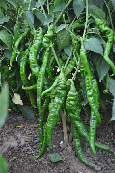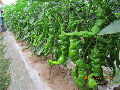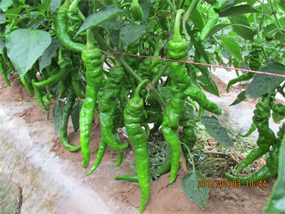 特征特性:陇椒10号属早熟一代杂种,生长势强,株高84厘米,株幅77厘米,单株结果数24个、果实羊角形、果长28厘米、果宽3.1厘米、肉厚0.25厘米,平均单果重62克,果色绿,果面皱、味辣,果实商品性好。干物质含量10.5g/100g,维生素C含量是84.8mg/100g,可溶性糖含量3.3 g/100g,品质优良,耐低温寡照。经省农科院植保所室内苗期人工抗疫病接种鉴定,陇椒10号属抗病类型。