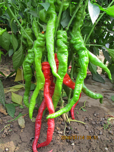 特征特性:陇椒11号属早熟一代杂种,生长势强,株高88cm,株幅74cm,单株结果数23个、果实羊角形、果长29cm、果宽3.5cm、肉厚0.25cm,平均单果重60g,果色绿,果面皱、味辣,果实商品性好。干物质含量6.66 g/100g,维生素C含量是53.4mg/100g,可溶性糖含量2.3g/100g,品质优良,耐低温寡照。经省农科院植保所对辣椒疫病在苗期进行人工接种抗病性鉴定,陇椒11号属中抗类型;辣椒白粉病田间自然发病抗性鉴定,陇椒11号属抗病类型。