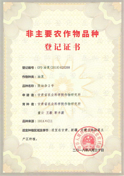 陇油杂2号系甘肃省农业科学院作物研究所组配而成的甘蓝型春油菜三系杂交种。株高147.97厘米左右,一次有效分枝数5.1个,单株角果数137.65个左右,千粒重3.56克。生育期110-118天,较青杂5号早5-7天,属于中早熟品种。含油率(粗脂肪)47.02%,芥酸0.08%,硫苷10.28umol/g,品质达到国际双低标准。生长势、抗病性强,结角层密,整齐一致,落黄性好,抗倒伏,综合经济性状优于当地现有的主栽品种,适宜密植和机械收获。 2016~2017年甘肃省春油菜品种区域试验中2年平均亩产217.49公斤,比对照青杂7号增产7.56%。在生产试验中,2017年在新疆昭苏平均折合亩产213公斤,较对照青杂5号增产4.9%;在内蒙古拉布大林平均折合亩产226.67公斤,较对照青杂5号增产6.9%。