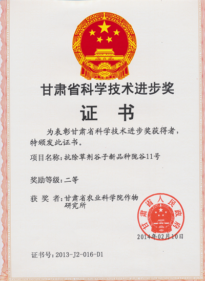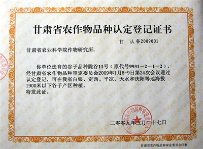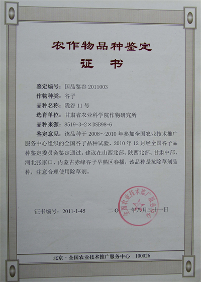 审(认)定情况:2009年通过甘肃省农作物品种审定委员会审定,2010年通过了国家谷子鉴定委员会的鉴定。