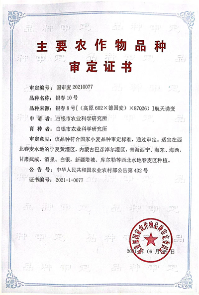 银春10号审定证书
