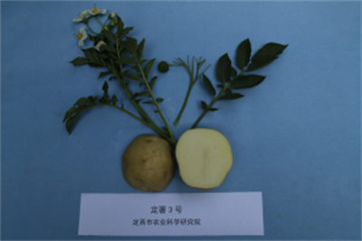 定西市农业科学研究院选育。晚熟,生育期128天左右,株型直立,株高68.5厘米,单株主茎数2.8个,成株繁茂。茎基部以上分枝较多,茎绿色,叶片较小,叶深绿色,叶缘平展,小叶着生较密,茎翼呈波状,茎横断面三菱形。花冠白色,天然结实差;薯块圆形,薯皮较粗,白皮白肉,芽眼浅而少;结薯集中,单株平均结薯数6.3个,平均单薯重118.1克,薯块商品率86.5﹪。薯块淀粉含量17.9﹪,干物质含量26.5﹪,还原糖含量0.21﹪,粗蛋白含量2.12﹪,VC含量15.9毫克/100克,适合鲜薯食用、淀粉、全粉和薯片加工。耐运输、贮藏;中抗晚疫病,抗马铃薯X病毒(PVX)和抗马铃薯Y病毒(PVY)。平均亩产量2200-4000kg。