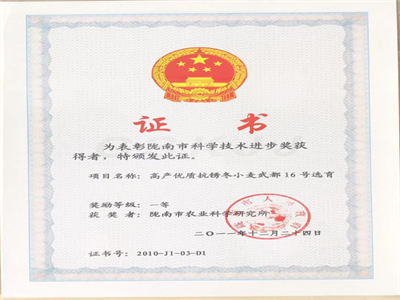 成果特点:该品种具有良好的丰产性能:其特点是大穂大粒,在多年多点的大田生产示范中,平均亩产400公斤以上,比当地主栽品种增产8%以上,表现良好的丰产性。具有突出的抗病性:成株期对小麦条锈病小种条中32号近免疫至高抗,对条中29号、31号近免疫至中抗,对水4免疫,对洛13ш和混合菌中感,但普遍率和严重度相对低。具有优良的品质:籽粒含粗蛋白13.7%,赖氨酸0.48%,沉降值50.8毫升。具有很强的抗逆性:多次在遇到严重旱情或遭受干热风影响的年份均表现出较好的稳产、丰产性能。