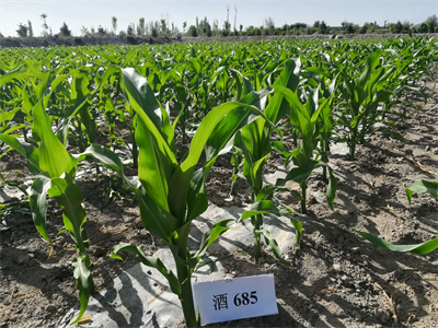 特征特性:酒685属于青贮玉米品种。幼苗叶鞘紫色,叶片绿色,生长势强。植株半紧凑,株高310.5厘米,穗位高141.5厘米,收获时叶片数15片。茎基紫色,花药黄色,颖壳绿色。花丝绿色,果穗筒型,穗长18.5厘米,穗粗5.5厘米,穗行数16.6行,行粒数34.4粒,穗轴红色,籽粒黄色、马齿型,千粒重402.1克。全株含粗蛋白6.61%,粗淀粉36.7%,中性洗涤纤维36.8%,酸性洗涤纤维23.0%。酒685在甘肃省的青贮生育期131天,比对照豫玉22早3天;籽粒生育期145天,较对照豫玉22早2天。平均倒伏(折)率3.6%,持绿性好。抗病性,经2017-2018年接种鉴定,抗禾谷镰孢茎腐病(R,病株率为9.1 %),感禾谷镰孢穗腐病(S,平均病情级别为5.7),中抗丝黑穗病(MR,发病株率为8.3%),感大斑病(S,病情级别为7)。