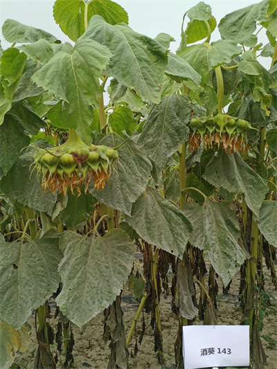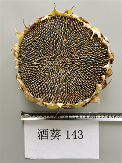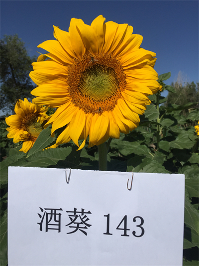 向日葵新品种酒葵143是酒泉市农科院以不育系XF118A为母本,以恢复系FK1421C为父本杂交选育而成的食用向日葵新品种,2021年通过中华人民共和国农业农村部登记,登记编号:GPD向日葵(2020)620333。