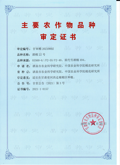 酒棉22号品种审定证书