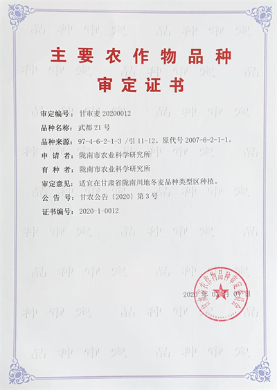 成果来源与鉴定:武都21号是以母本97-4-6-2-1-3/父本引11-12,采用系谱法选育而成。系谱号为2007-6-2-1-1。2020年3月通过甘肃省品种委员会审定。