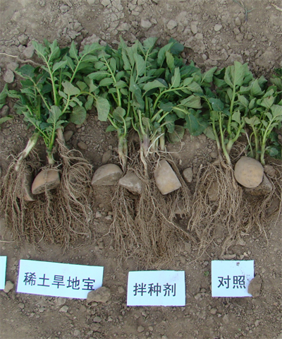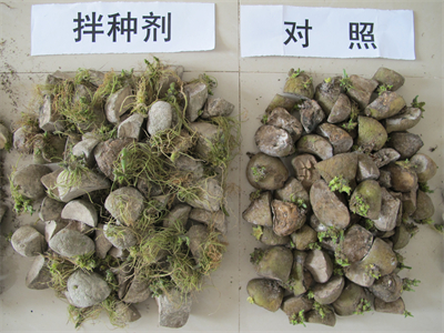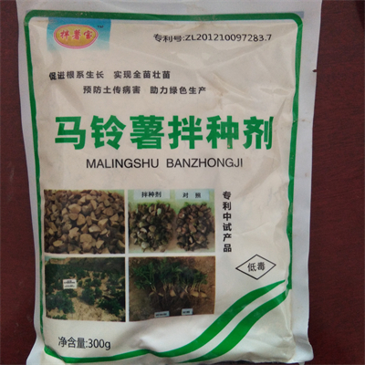 2、技术特点:马铃薯拌种剂注重了保护性广谱杀菌剂与高效低毒内吸性杀菌剂的复配,同时加入了粘附剂,既有利于延缓病菌抗性的产生,又具有内吸治疗和保护作用,附着效果好,抗旱防病,投资少、增效大。使用该拌种剂后,可起到促进种薯切块伤口愈合、防止病菌感染、减少水分散失、保持种块营养、促进根系发育、保苗、壮苗、延长绿叶功能期等作用。拌种后在旱作田还兼有驱鼠作用。