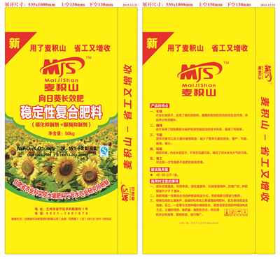 向日葵长效肥,(N+P2O5+K2O≥46%,26-15-5)由甘肃省农业科学院土壤肥料与节水农业研究所根据当归养分需求规律、主产区土壤特征以及多年施肥试验结果研发而成,内含长效因子,应用了硝化抑制剂、脲酶抑制剂的双向协同互促作用,供给养分有效期长,肥料利用率高。实现了一次性施入全生育期所需的所有肥料的可能。