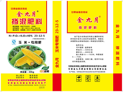 金九月玉米专用掺混肥,(N+P2O5+K2O≥40%,23-12-5)由甘肃省农业科学院土壤肥料与节水农业研究所研制,甘肃金九月肥业有限公司生产,根据玉米养分需求规律、主产区土壤特征以及多年施肥试验结果研发而成的一种作物专用肥料,本产品综合考虑了玉米对大、中、微量元素的全面需求,配方独特,肥料利用率高。
