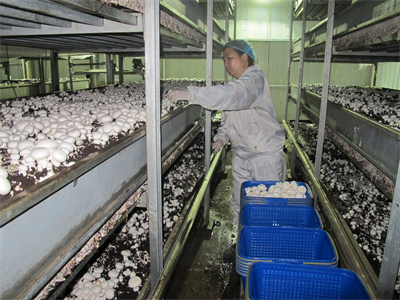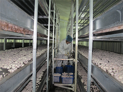 采用工业化的技术手段,在相对可控的环境设施条件下,利用高效率的机械化、自动化作业,实现双孢蘑菇的智能化、标准化和周年化生产。采用培养料隧道发酵工艺技术可生产出混合均匀、发酵充分、理化性状稳定、不含有害杂菌的优质培养料。采用智能菇房栽培环境调控技术创造了双孢蘑菇生长各生理期适宜的生态环境,菌丝体、子实体生长健壮,栽培产量高、品质优。