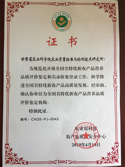 全国名特优新农产品营养品质评价鉴定与名录收集登录,依托甘肃省农业科学院农业质量标准与检测技术研究所科技平台“全国名特优新农产品营养品质评价鉴定机构(CAQS-PJ-0043)”,利用“甘肃省名特优新农产品品质评价与标识关键技术”等相关品质评价项目成果,筛选出品质鉴定评价的基本和特质性品质,构建了“N(基本品质指标)+X(特质性品质指标)”品质鉴定评价技术,准确评价了兰州百合、岷县当归、靖远滩羊、定西马铃薯、榆中高原夏菜、秦安苹果、武都花椒等39个“甘味”农产品品质优良的评价结论并出具了评价鉴定报告,现已推荐的21个“甘味”农产品进入全国名特优新农产品登录系统,并通过“农安科普”、“中国农产品质量安全"微信公众号等自媒体在全国进行产品宣传和品牌展示。为培育地方特色农产品品牌,促进区域优势农业产业发展和农产品产销对接起到了积极推动作用。