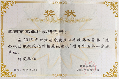 《陇南板蓝根规范化种植基地建设》项目成果获得2015甘肃省农业农村厅农牧渔业丰收奖二等奖。内容主要有:1.解决了板蓝根栽培品种的混杂问题,遴选出了规范化生产示范基地主栽优良品种1个。2.通过对板蓝根病虫草害的调查和研究,利用综合防治的方法,解决长期使用高毒化学农药防治病虫草害,造成的农药残留问题,以及对土壤环境的污染问题,使农药残留量降低,原药符合药用标准。3.通过配方施肥,解决了因大量施用化肥引起的板蓝根有效成份下降、质量不稳以及土壤板结等问题。4.产品检验结果:经陇南市食品药品检验检测中心对提供样品的检验,对照《中国药典》(2010年版)得出结论:浸出物30.6%,比规定标准高出5.6个百分点;R﹒S-告依春(C5H7NOS)0.038%,比规定标准高出0.018个百分点(详见检验报告)。5、通过该项目的完成,在康县建立了甘肃省板蓝根规范化种植示范基地2500亩。6、制定出了《陇南市板蓝根生产技术规程》。该规程按规定程序2014年12月23日已由甘肃省质量技术监督局批准发布为甘肃省地方标准,标准号为DB62/T1491-2014。