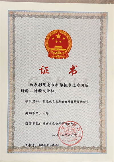 《纹党优良品种选育》项目成果获得2014年陇南市科技进步一等奖,2015年甘肃省科技进步三等奖。内容主要有:①项目提出了纹党优良品种的选育方法和思路,给中草药优良品种的选育摸索出了成功经验和途径;②探索出了纹党优良品种选育的技术路线方案。按确定的育种目标要求进行定向选育,采用单株多次选择法进行选种,首先收集纹党种质资源(包括野生资源)的优良单株种子,建立种质资源圃(即原始材料圃),集中种植观察,多次从中选优,直到后代生长性状表现一致、遗传性趋于稳定的可确定为新品系;③选育出了纹党优良品系—WD2006-1;④掌握了与新品系相配套的丰产栽培技术,总结编写出了《陇南纹党规范化生产技术规程》;⑤掌握了纹党丰产的关键技术是育苗移栽和控制开花结籽、控制地上部徒长。