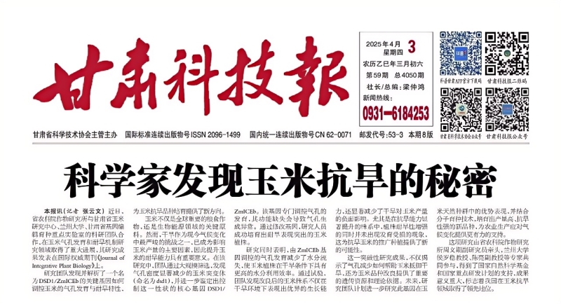 据悉,该研究成果一经发表,引起了广泛阅读(JIPB公众号中文相关报道阅读量超过5000人次),2025年4月3日甘肃科技报,以头版头条的形式报道了我院的该项研究成果,题目为《科学家发现玉米抗旱的秘密》。