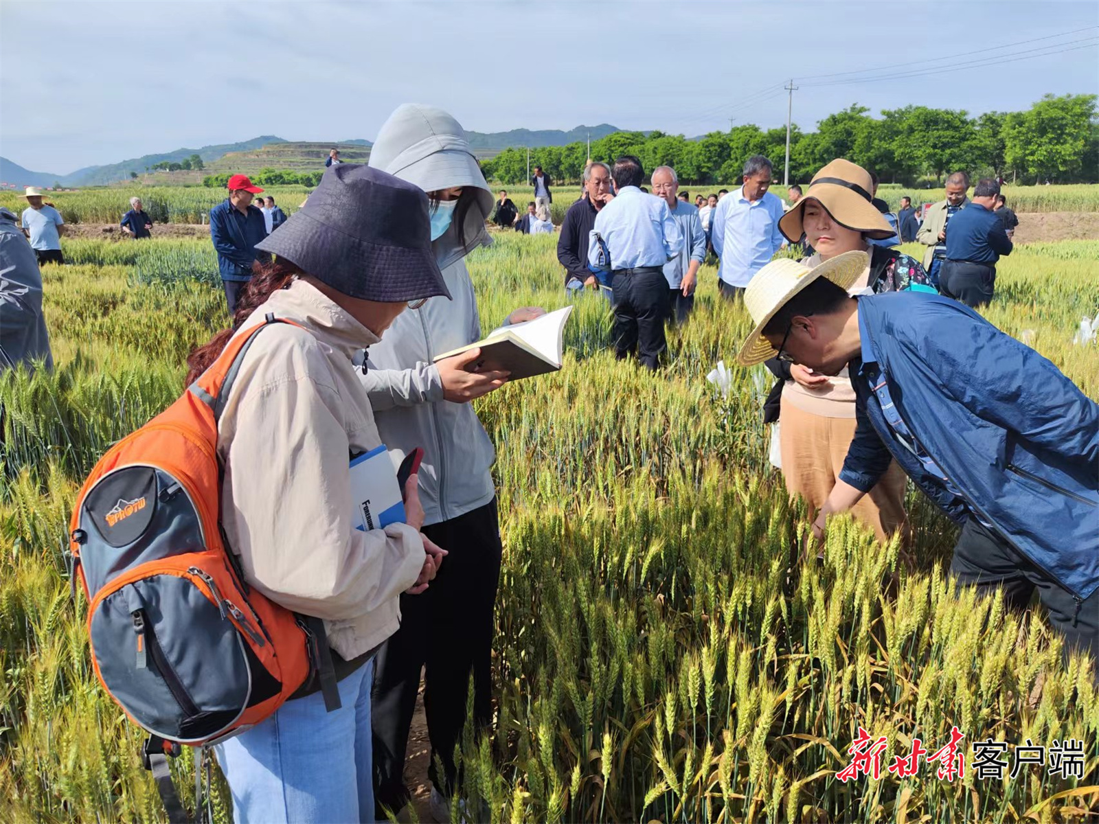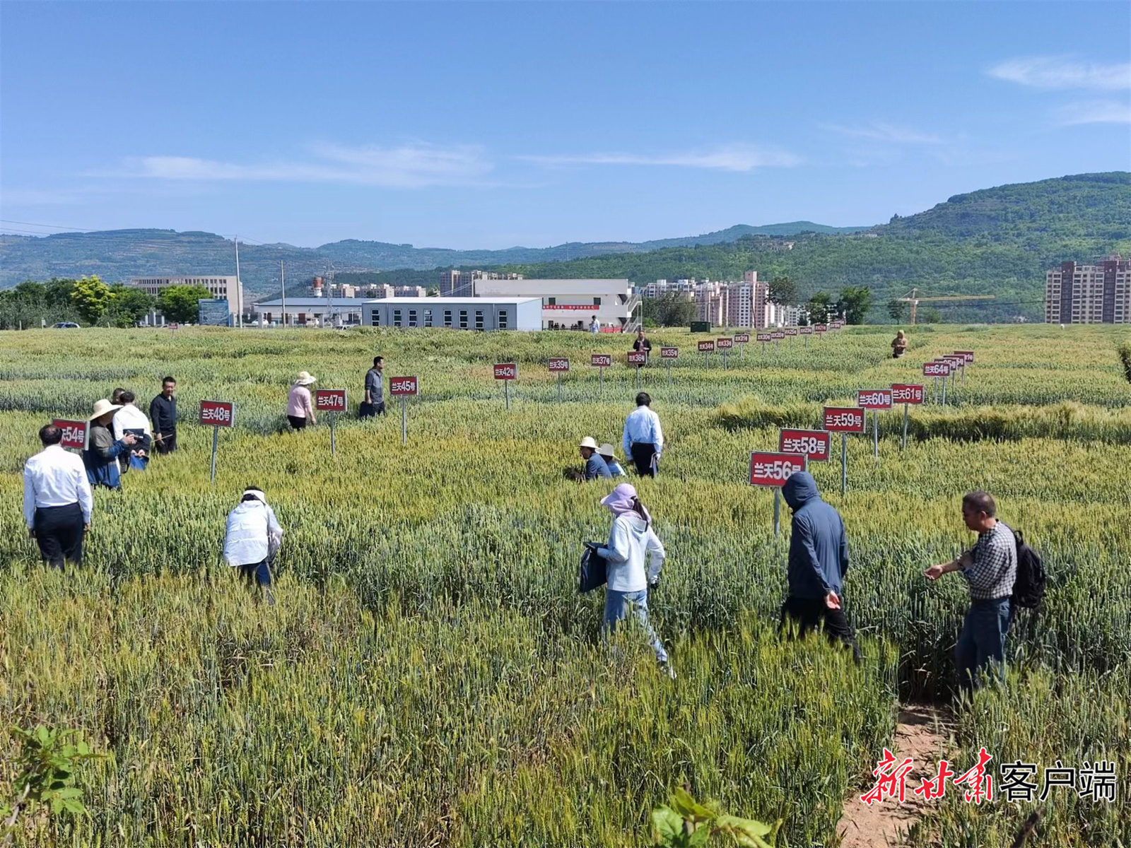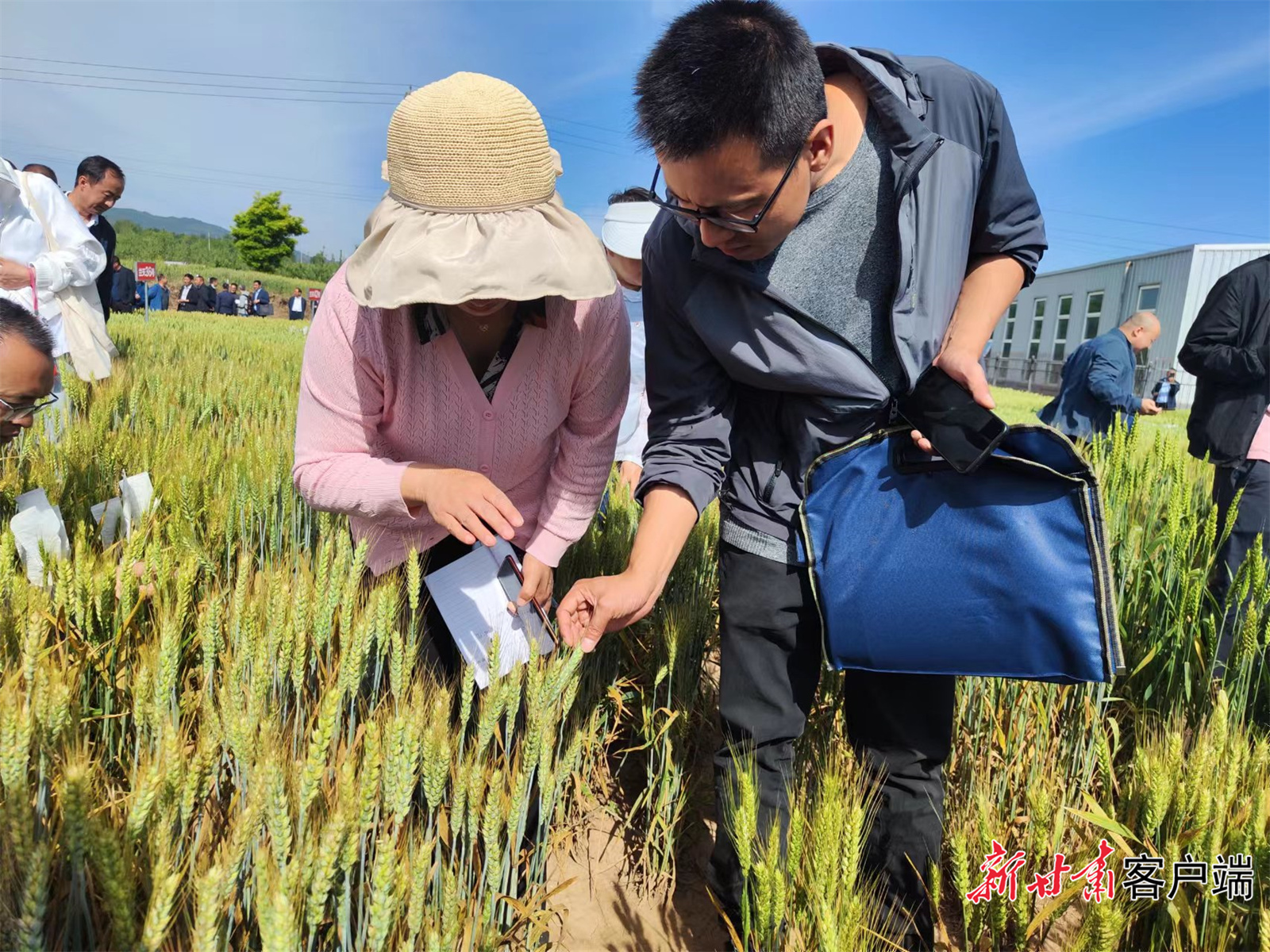 农科专家走进清水试验站试验田对比查看兰天系列小麦与国内主产区的小麦品种长势。