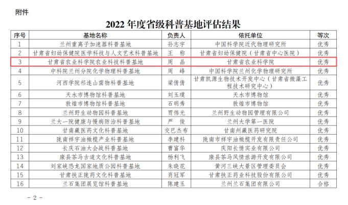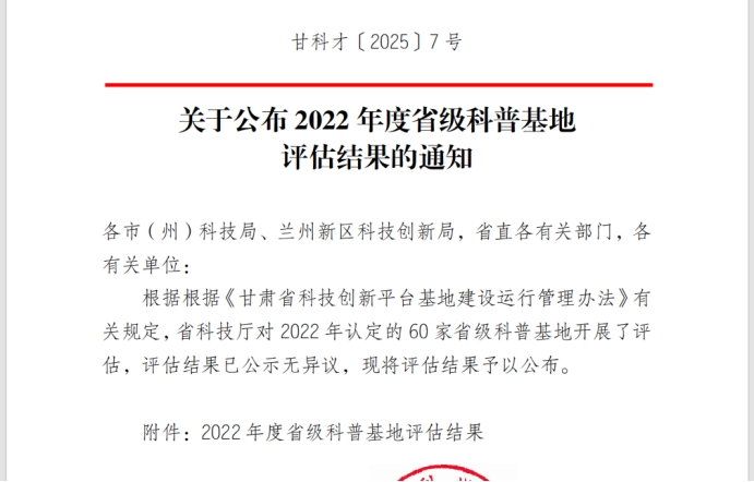 近日,甘肃省科学技术厅公布了《关于公布2022 年度省级科普基地评估结果的通知》,省科技厅对 2022 年认定的 60 家省级科普基地开展了周期评估,最终认定15家单位获评“优秀”,我院科普基地被评为“优秀”等次。