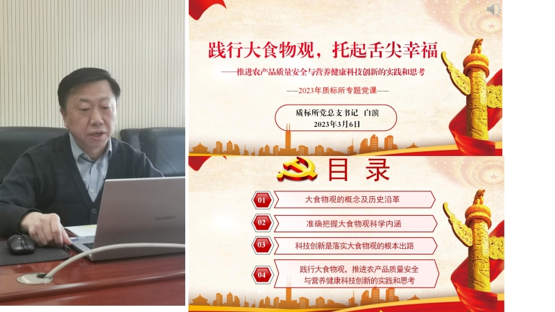 质标所党总支书记白滨作了题为《践行大食物观,托起舌尖幸福》的专题党课,重点围绕大食物观的概念及历史沿革、准确把握大食物观科学内涵 、科技创新是落实大食物观的根本出路 、推进农产品质量安全与营养健康科技创新的实践和思考等方面,就如何践行大食物观,全面提升农产品质量和食品安全水平,助力农业供给侧结构性改革,推进农业提质增效,实现农业可持续发展提出了目标和要求。白滨同志的党课脉络清晰、紧扣主题,重点突出、切合实际,对我所如何推进农产品质量安全与营养健康科技创新指明了方向。