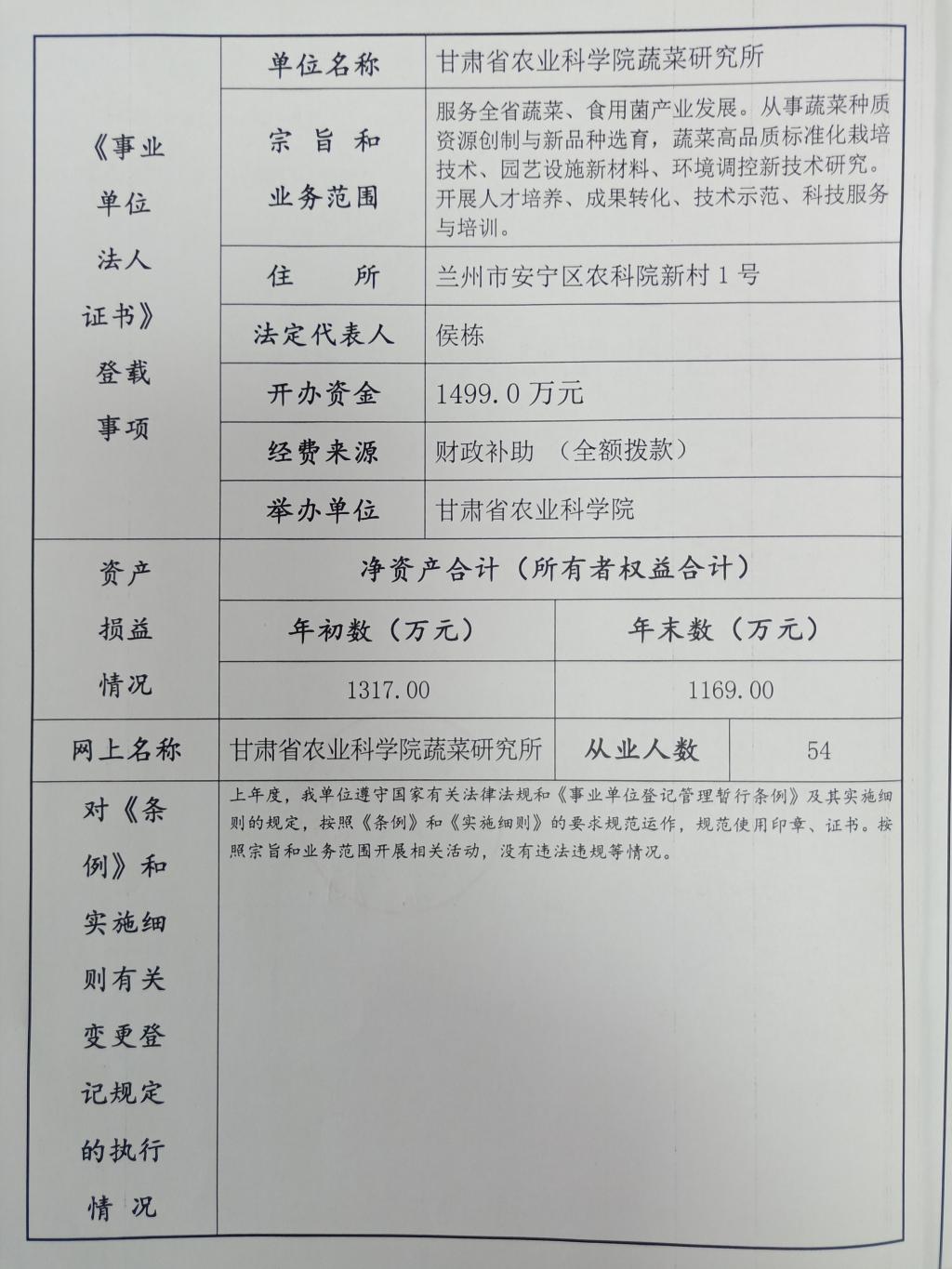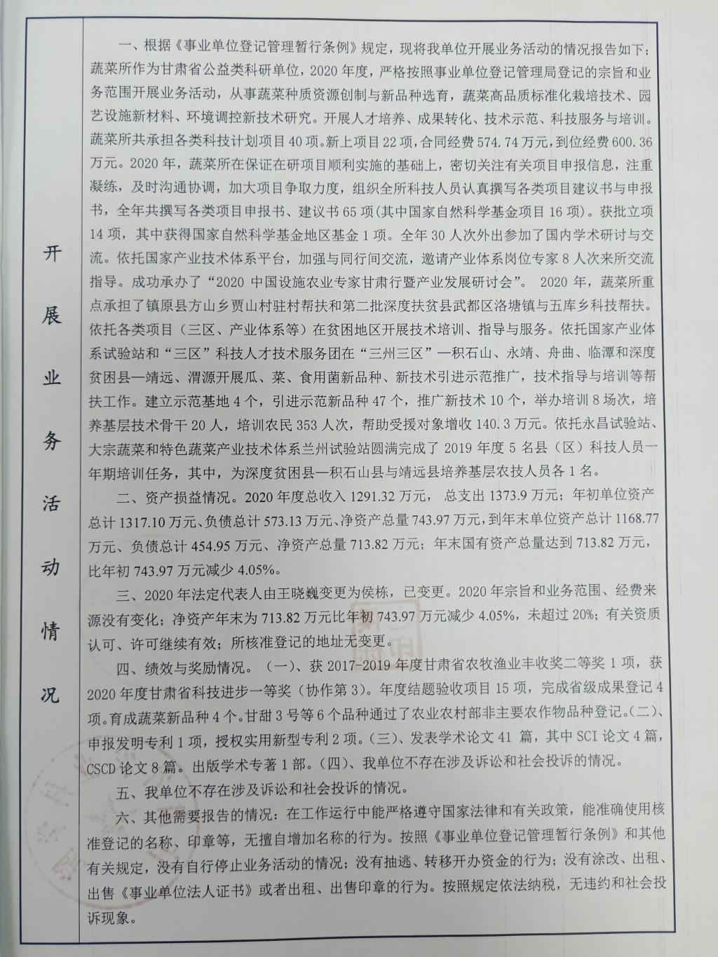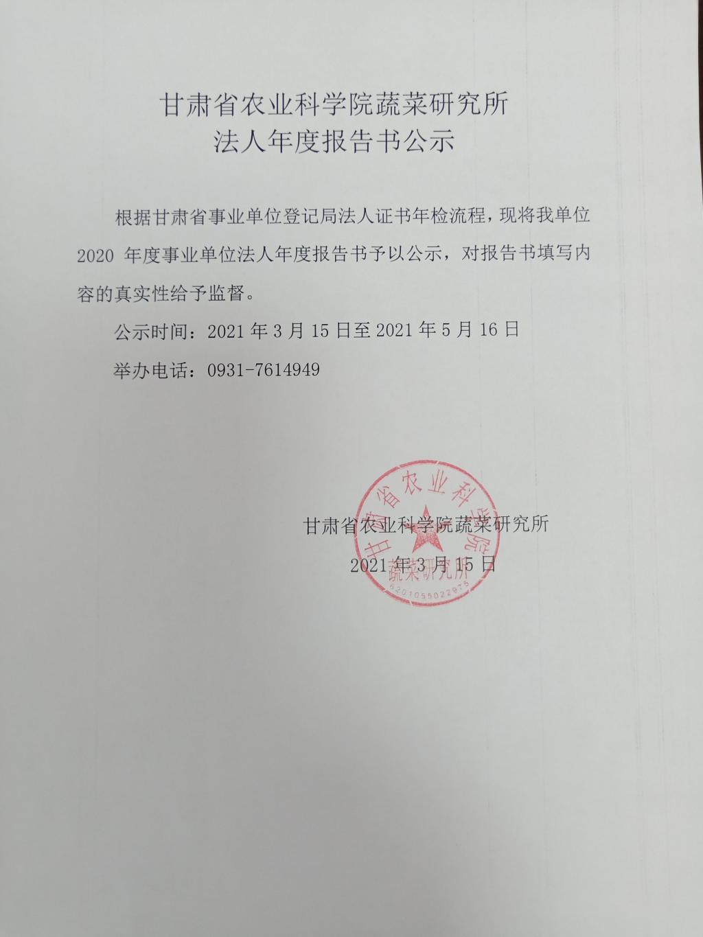 根据甘肃省事业单位登记局法人证书年检流程,现将我单位2020年度事业单位法人年度报告书予以公示,对报告书填写内容的真实性给予监督。