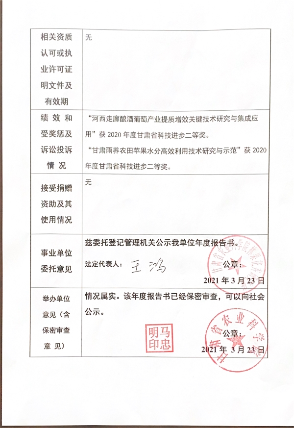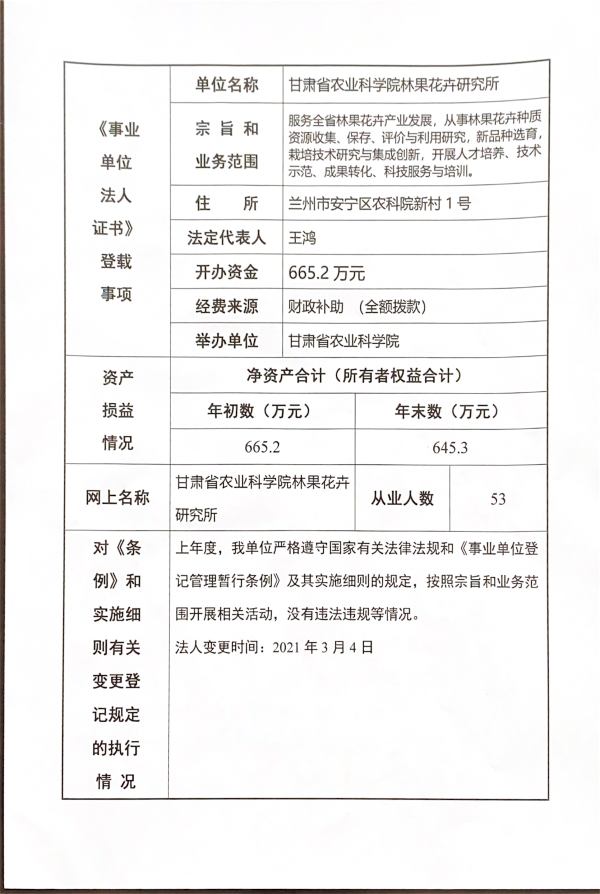 根据甘肃省事业单位登记局法人证书年检流程,现将我单位2020年度事业单位法人年度报告书在院局域网予以公示,对报告书填写内容的真实性给予监督。
