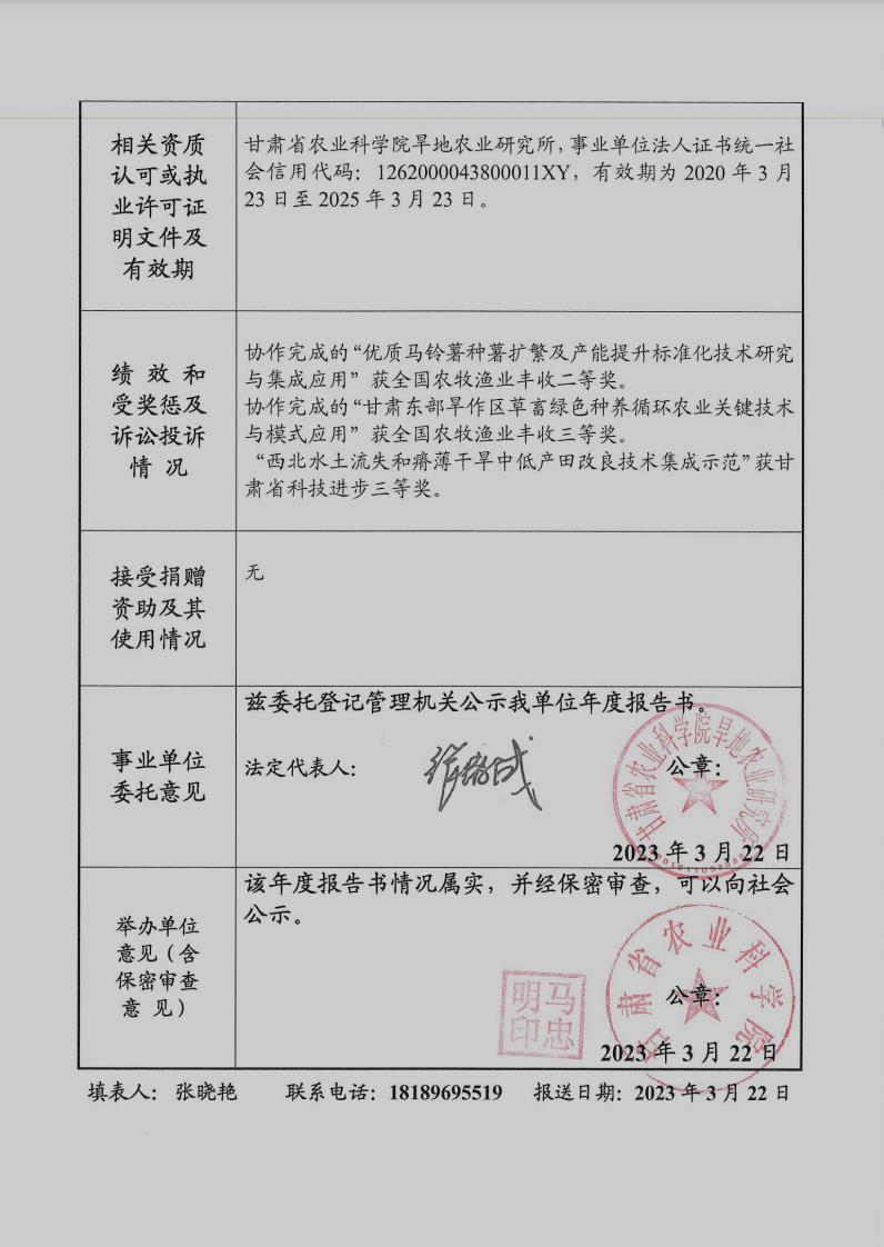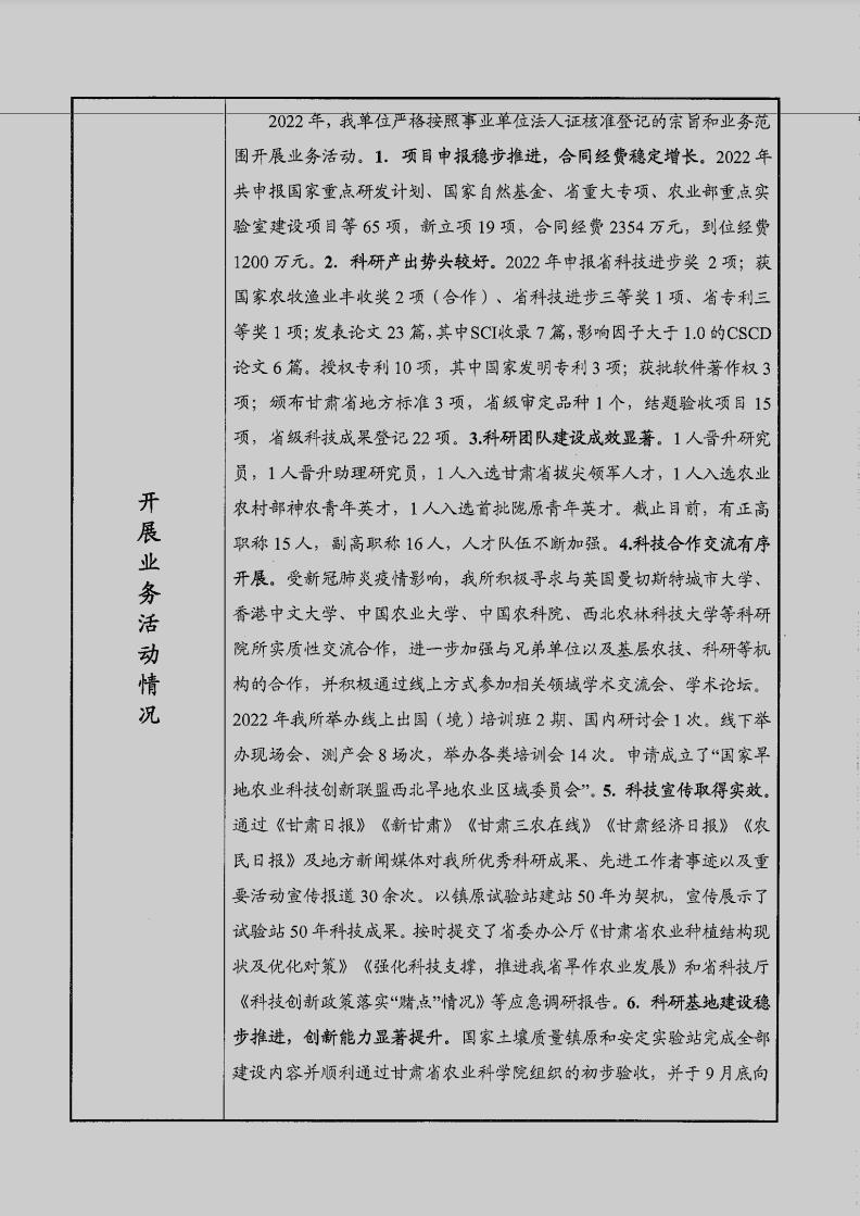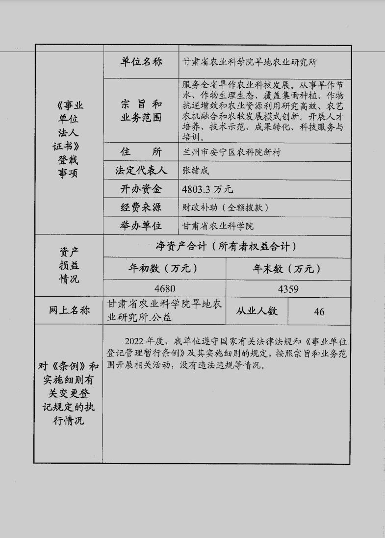 根据甘肃省事业单位登记局法人证书年检流程,我单位法人证书的年检报告书需在院局域网上进行公示,现将我单位2022年度事业单位法人年度报告书予以公示,对报告书填写内容的真实性给予监督。