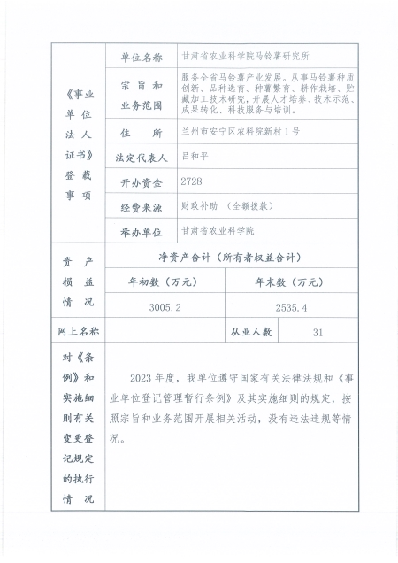根据甘肃省事业单位登记局法人证书年检流程,现将我单位2023年度事业单位法人年度报告书在院局域网予以公示,对报告书填写内容的真实性给予监督。